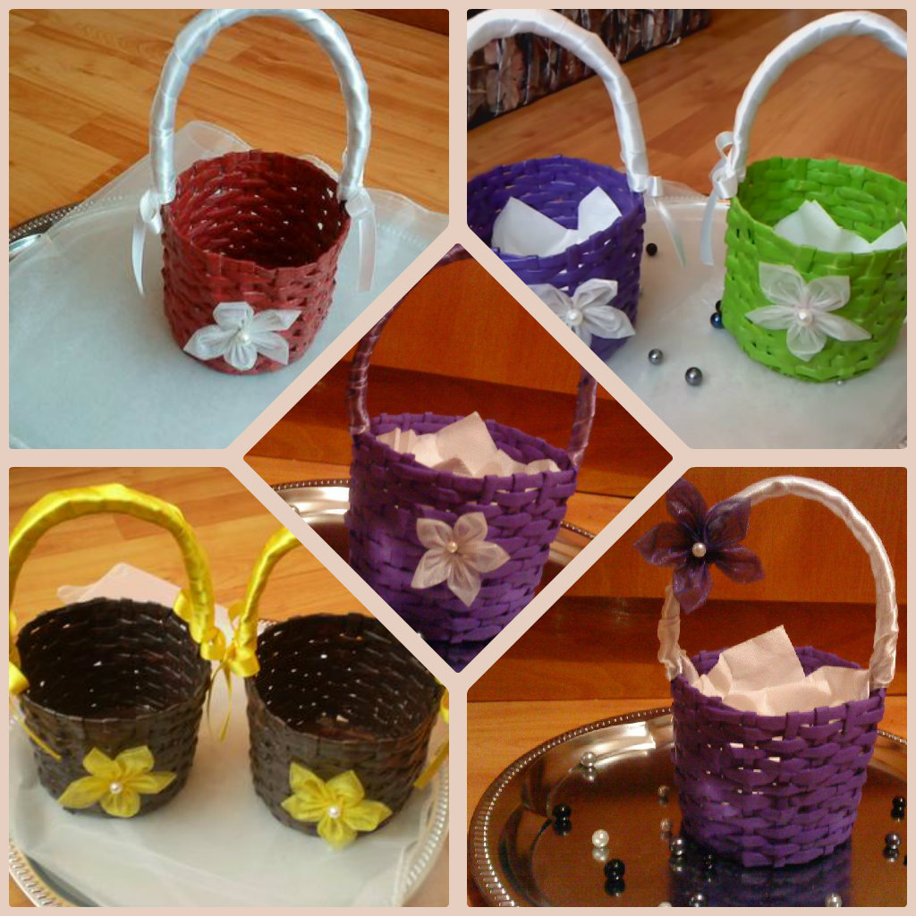 Košíčky pre družičky vyrobené metódou papierového pletenia, prepletené stuhou na rúčke a ozdobené kvietkom z organzy. Vhodné na uloženie svadobných pierok, lupienkov ruží alebo ryže.